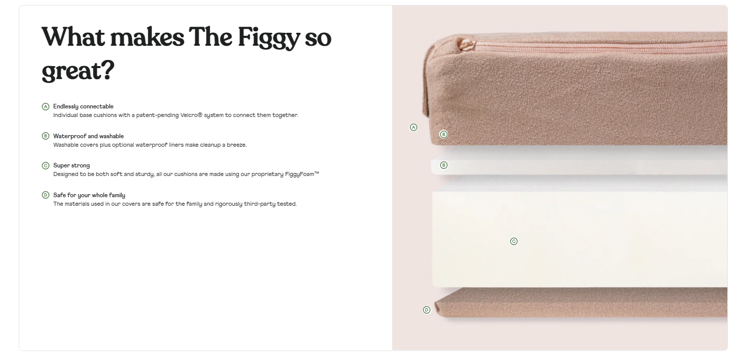 Figgy was designed for kids, not just as a mini couch. With Velcro connectors for endless stackable play, waterproof and machine-washable covers, and FiggyFoam for strength, safety, and softness, it’s built to handle everyday adventures. Made with toxin-free, high-quality materials, hidden zippers, and proudly crafted in the USA, Figgy combines durability, safety, and fun in every piece.