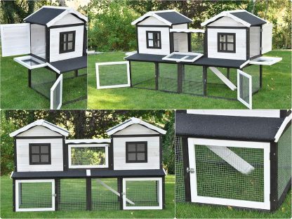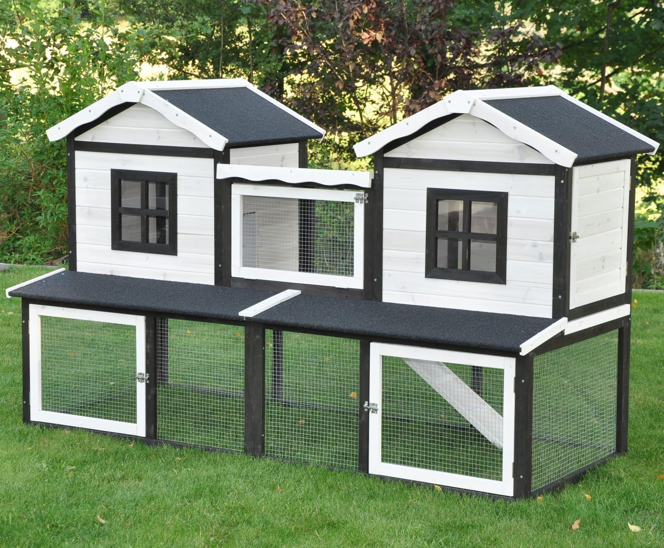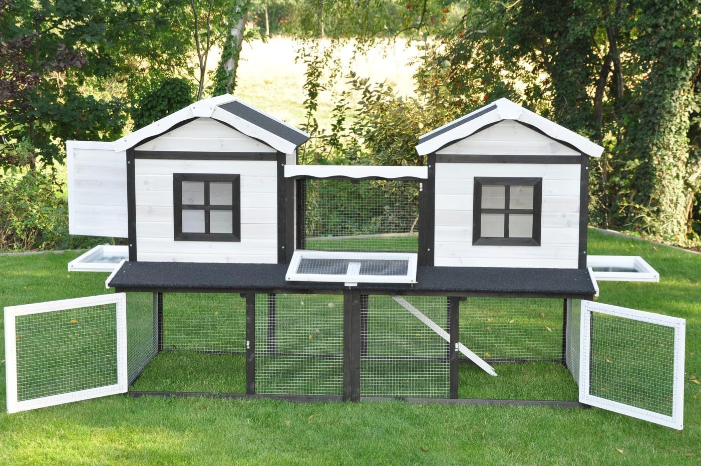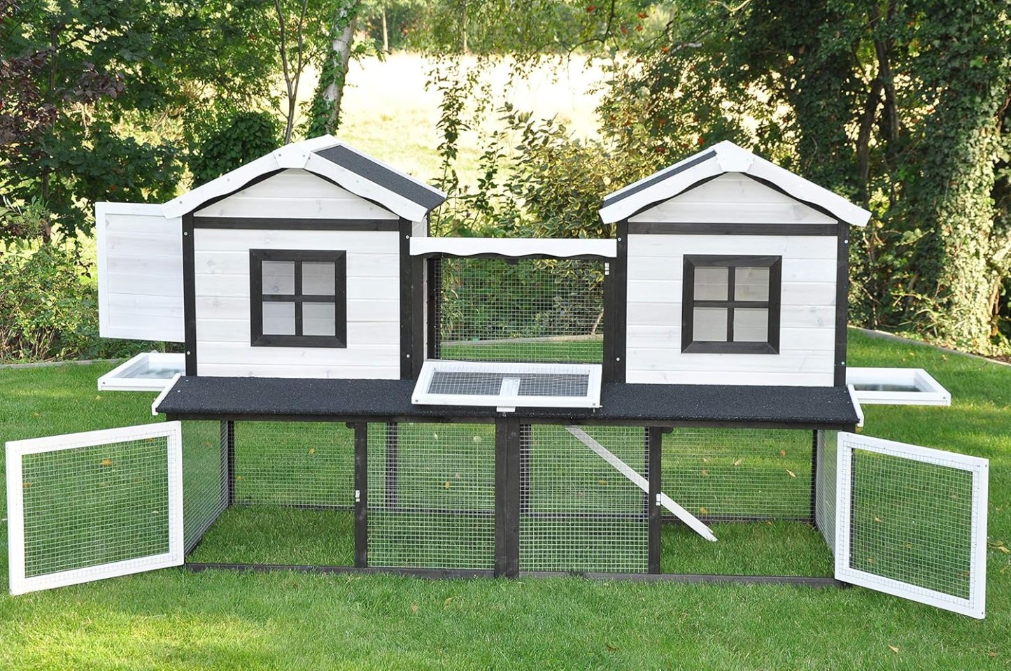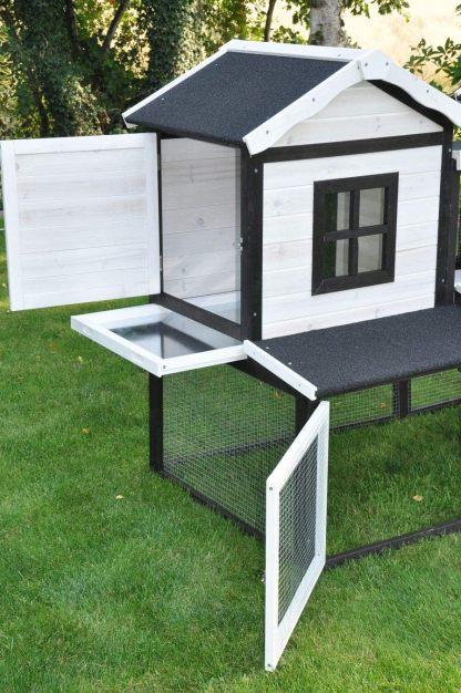EINFACHE REINIGUNG - Mit 2 seitlichen Türen und herausziehbaren Metall Kotwannen. Mit 2 Fronttüren beim Freigehege - 2 Türme als Rückzugsort - Obergeschoß komplett begehbar