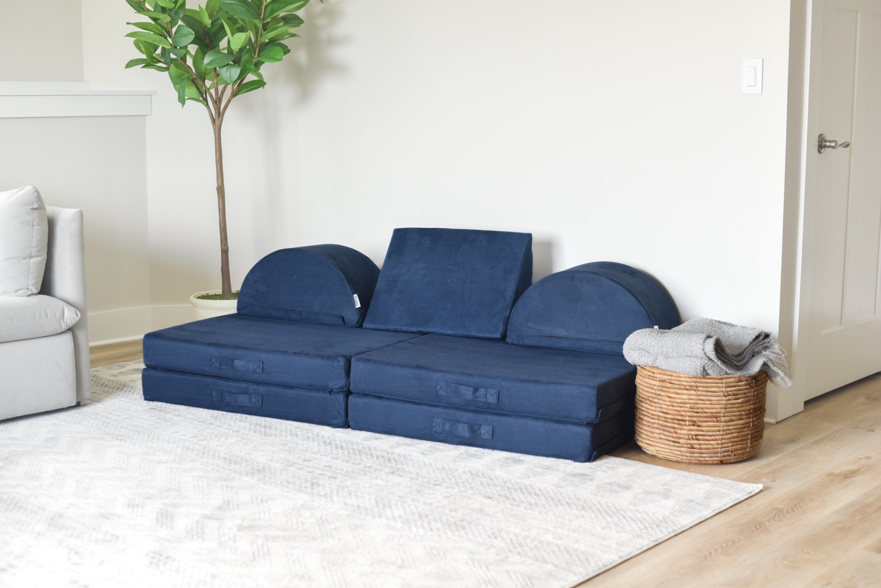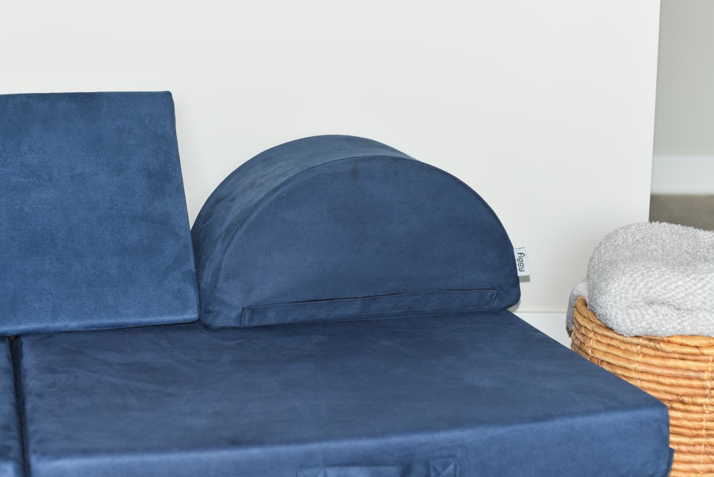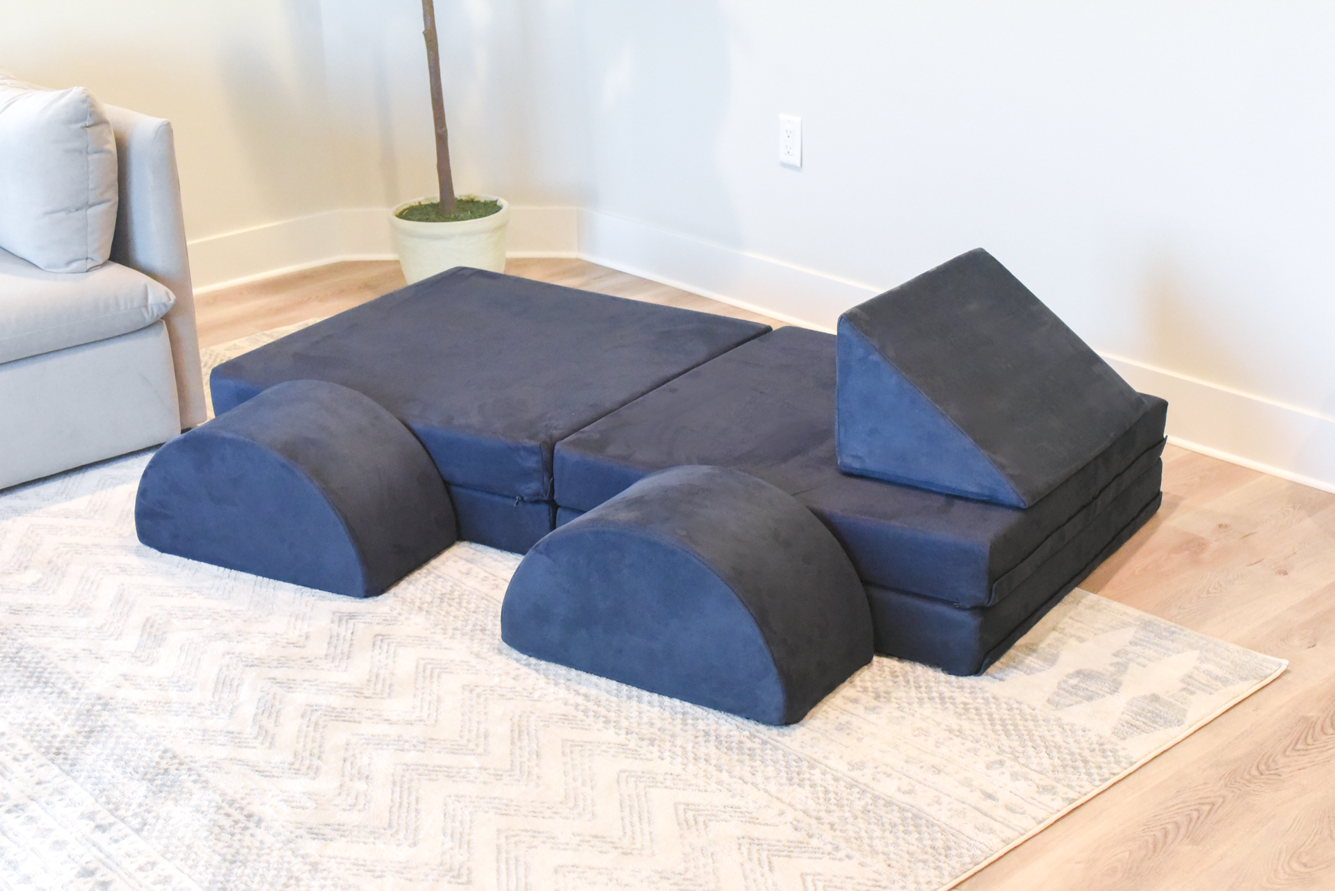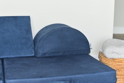 A raft on the high seas. A treehouse high in the sky. A rocketship to the moon. This play couch is anything and everything an imagination can create. The Figgy comes with velcro connectors to connect individual base cushions together into ball pits, forts or even tumbling mats! The Figgy with Half Moon cushions showcases the half moon pillows which can be used individually or connected to create wheels, ottomans or other unique shapes. The Figgy play couch with half moons includes 4 base cushions, 2 half moons, and a wedge. Add optional waterproof liners to prevent against accidents.